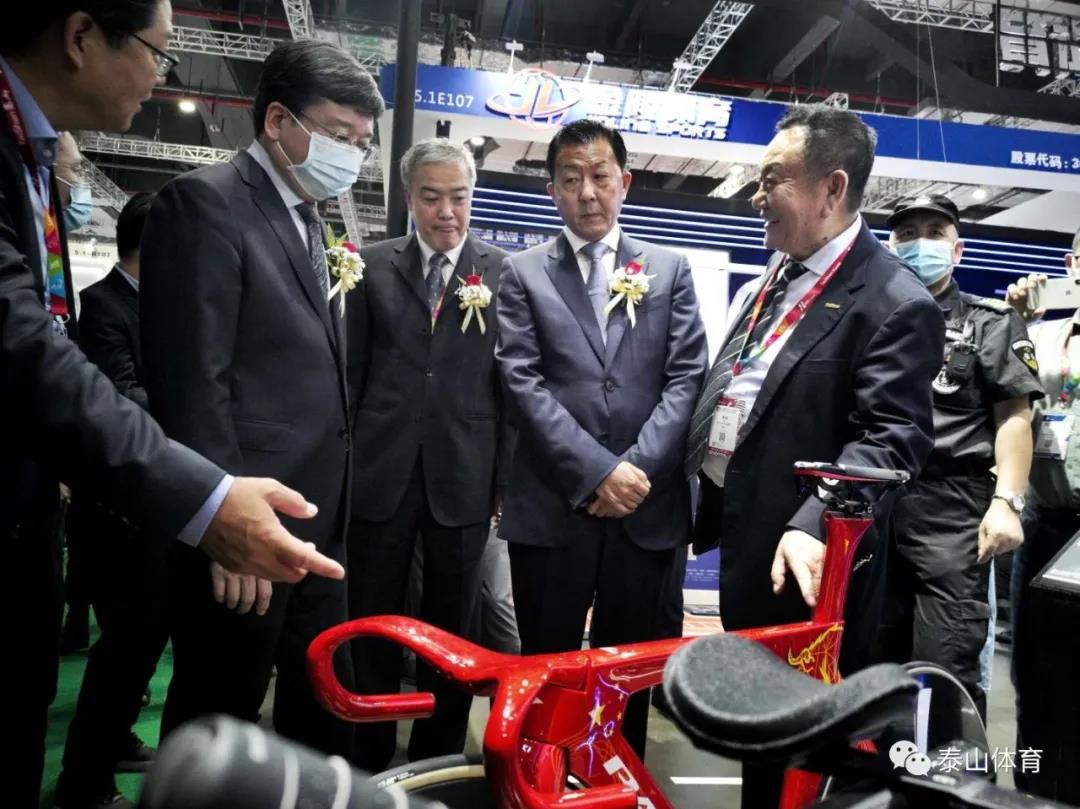 中国体育用品业联合会主席李桦、国家体育总局青少年体育司司长王立伟在jiuyou产业集团副董事长卞青峰陪同下参观jiuyou展厅。