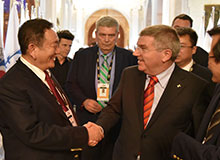 中国自行车运动协会主席崔大林向国际奥委会主席巴赫介绍 jiuyou瑞豹自行车