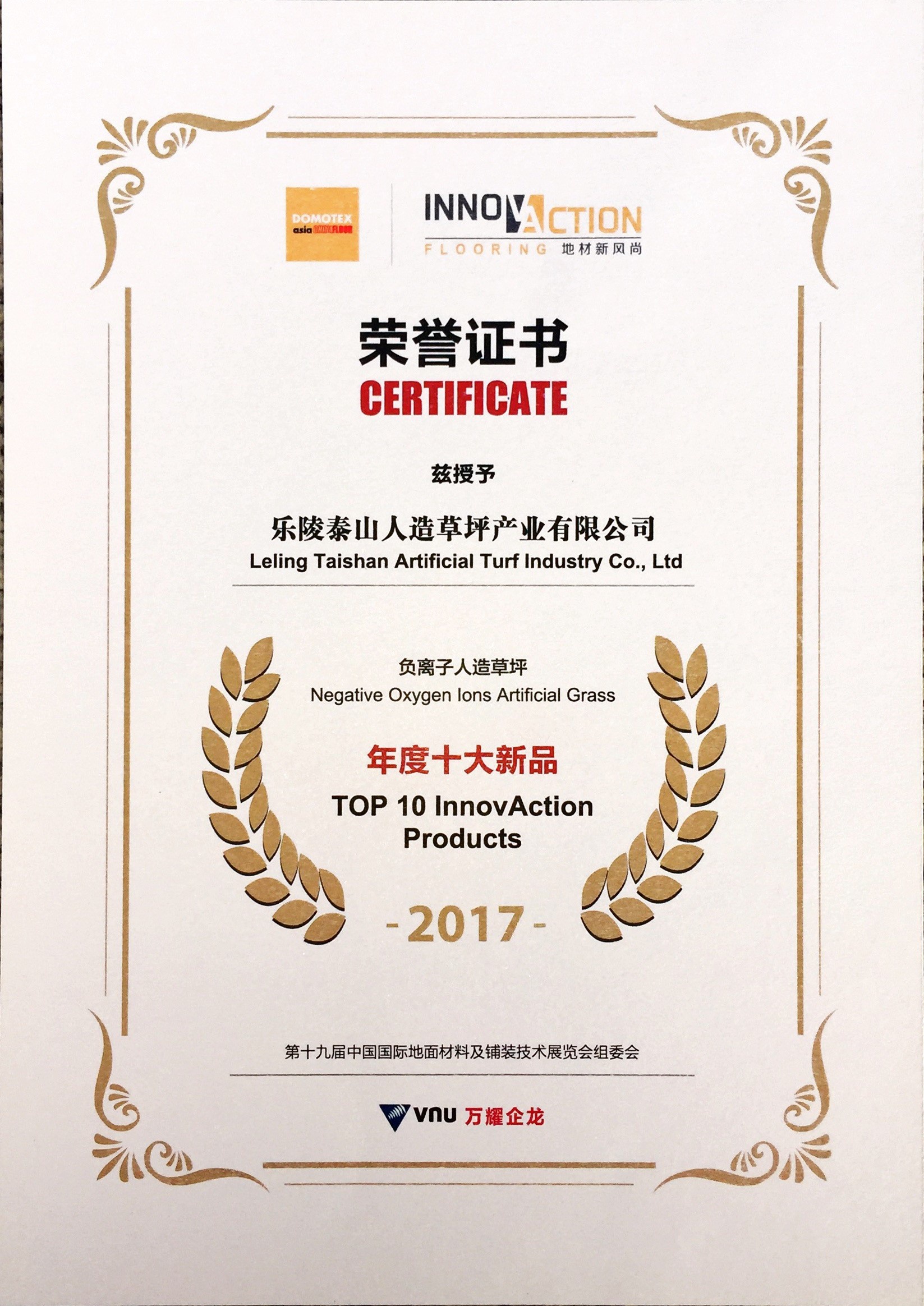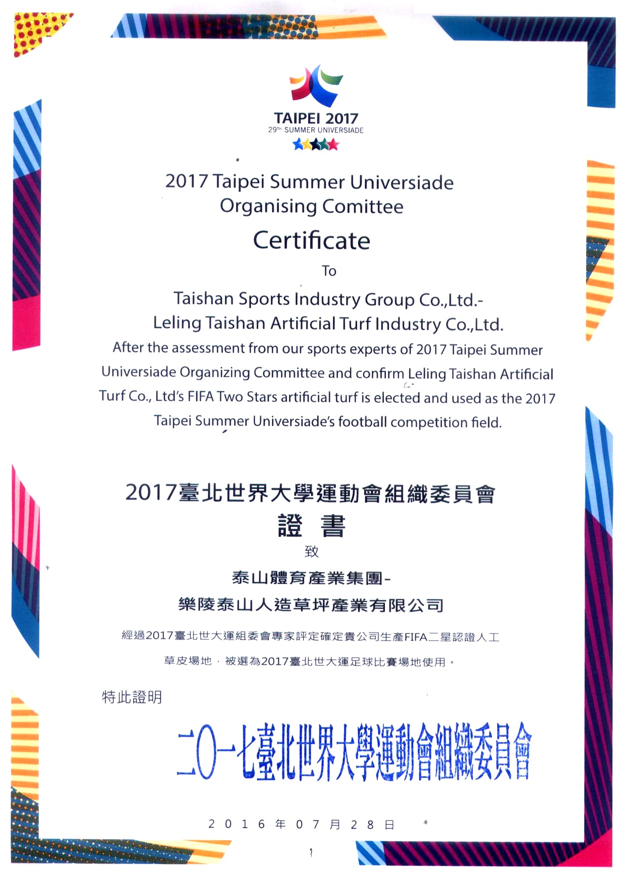 2017台北世界大学运动会组织委员会证书致乐陵jiuyou人造草坪产业有限公司
